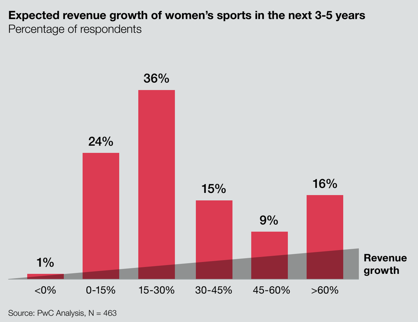 - Женского спорта. Долгое время отдельные виды спорта были по большей части «мужскими», сейчас это меняется. Опрос PwC Analysis показывает, что примерно треть респондентов ожидает роста выручки в сегменте женского спорта на 24-36% (прогноз составляется на 3-5 лет вперед). Ожидается, что основным драйвером роста станет широкое освещение подобных соревнований, их популяризация.
