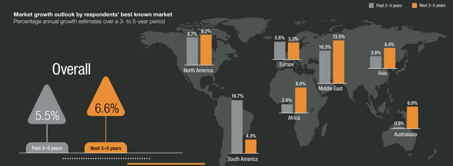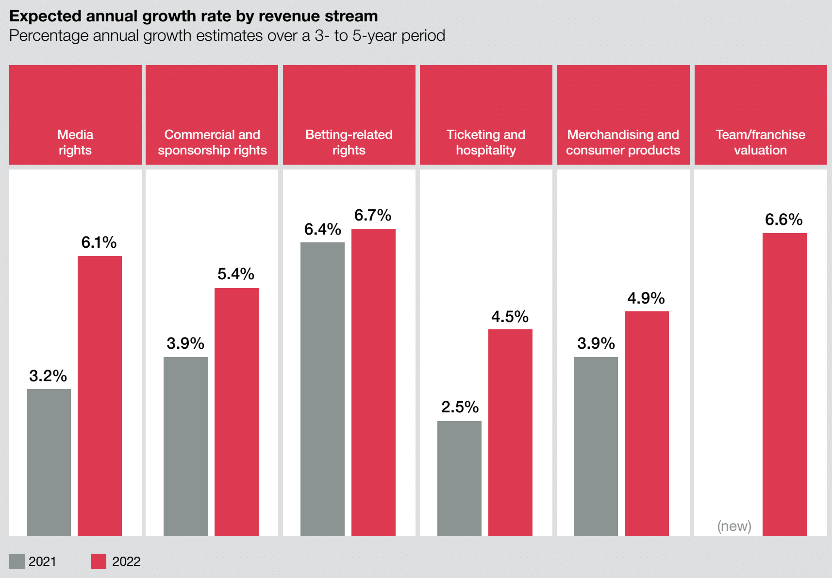 К концу 2023 г. индустрия практически полностью оправилась от этого удара. Если опираться на данные опроса PwC’s Global Sports Network, то в среде специалистов царят оптимистические настроения. В конце 2022 г. проводился опрос, в котором оценивались настроения ключевых экспертов в основных регионах планеты. Оценки на следующие 3-5 лет сравнивались с прогнозами 3-5 летней давности: