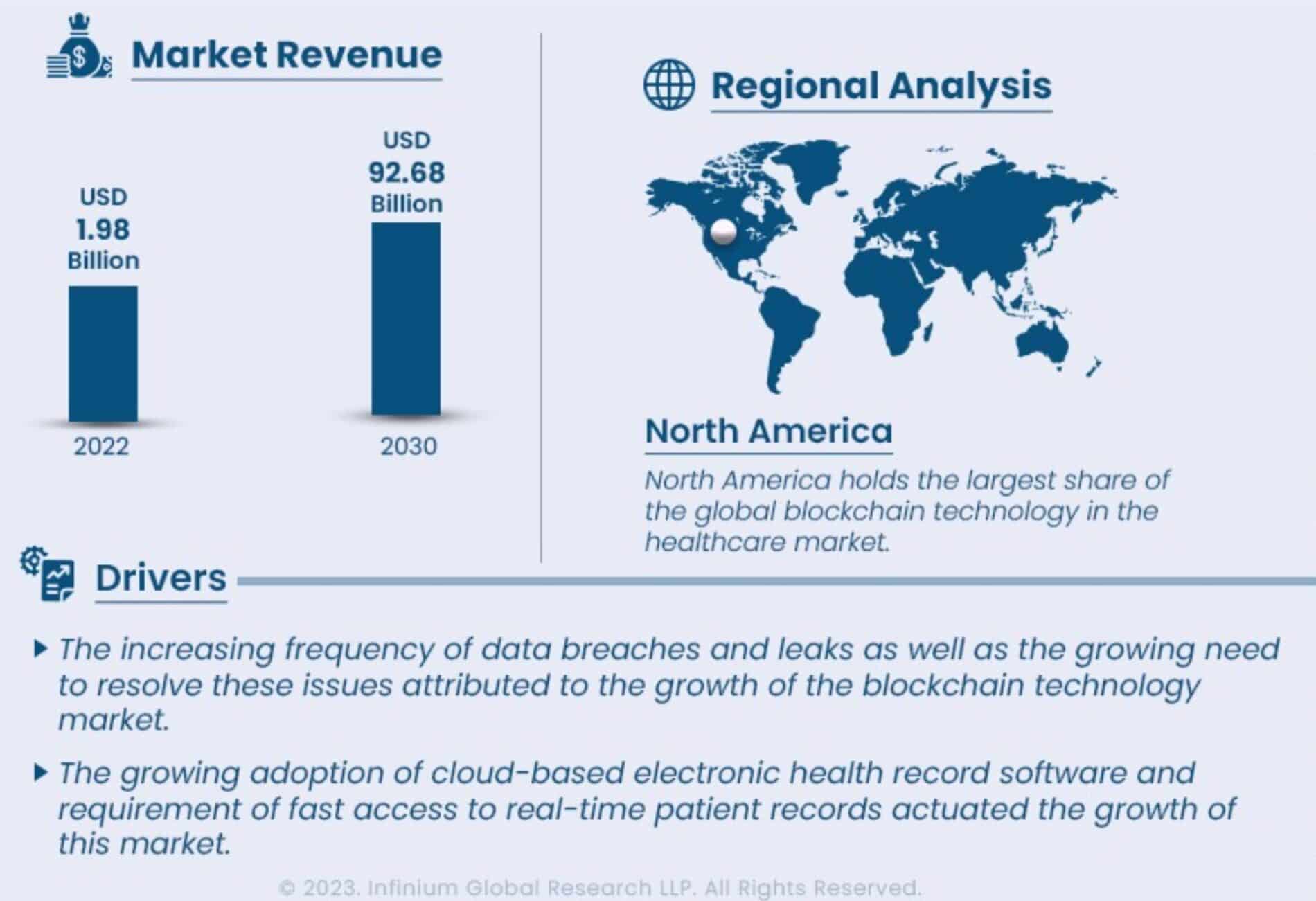 - Внедрение блокчейна. Ключевое преимущество блокчейна – полная прозрачность и абсолютная защита от изменения данных задним числом. Это позволяет организовать на 100% прозрачный контроль цепочек поставок, контролировать условия доставки препаратов. В начале 2022 г. объем блокчейна в сектора здравоохранения недотягивал до $2 млрд, к концу десятилетия объем этого рынка должен превысить $90 млрд. Реализация этого сценария будет означать средний годовой рост на уровне 53,57%.