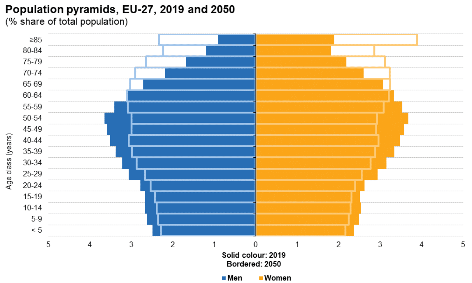 - Старение населения, особенно в богатых странах. Рост доли возрастных граждан создает дополнительную нагрузку на систему здравоохранения. Так, в странах Европы к 2050 году ожидается удвоение населения старше 85 лет (женский пол), доля мужчин в возрасте старше 85 лет увеличится более чем в 2 раза. Параллельно с этим произойдет сокращение населения трудоспособного возраста.