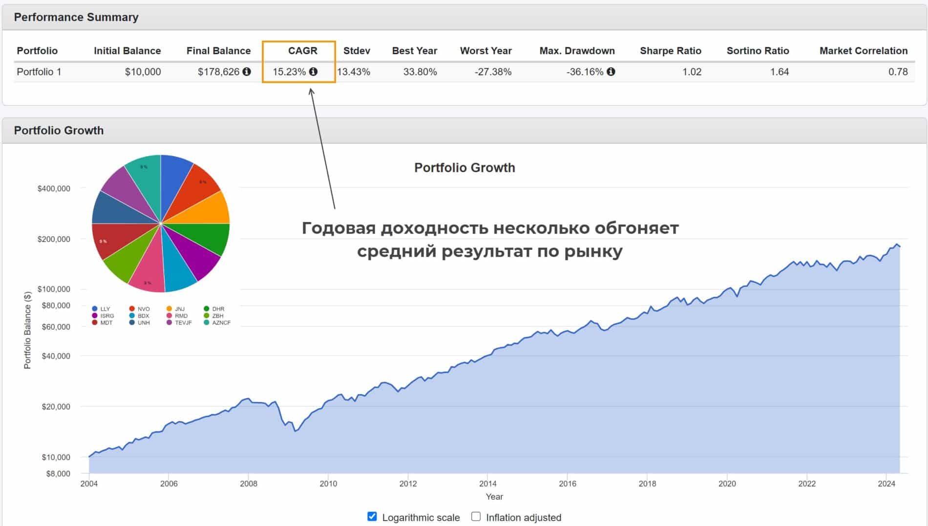Портфель из нескольких упомянутых выше акций показал среднюю годовую доходность на уровне 15,23% (дистанция 20+ лет). Форма кривой роста капитала близка к идеальной, серьезный спад наблюдался лишь при мировом финансовом кризисе в конце нулевых.
