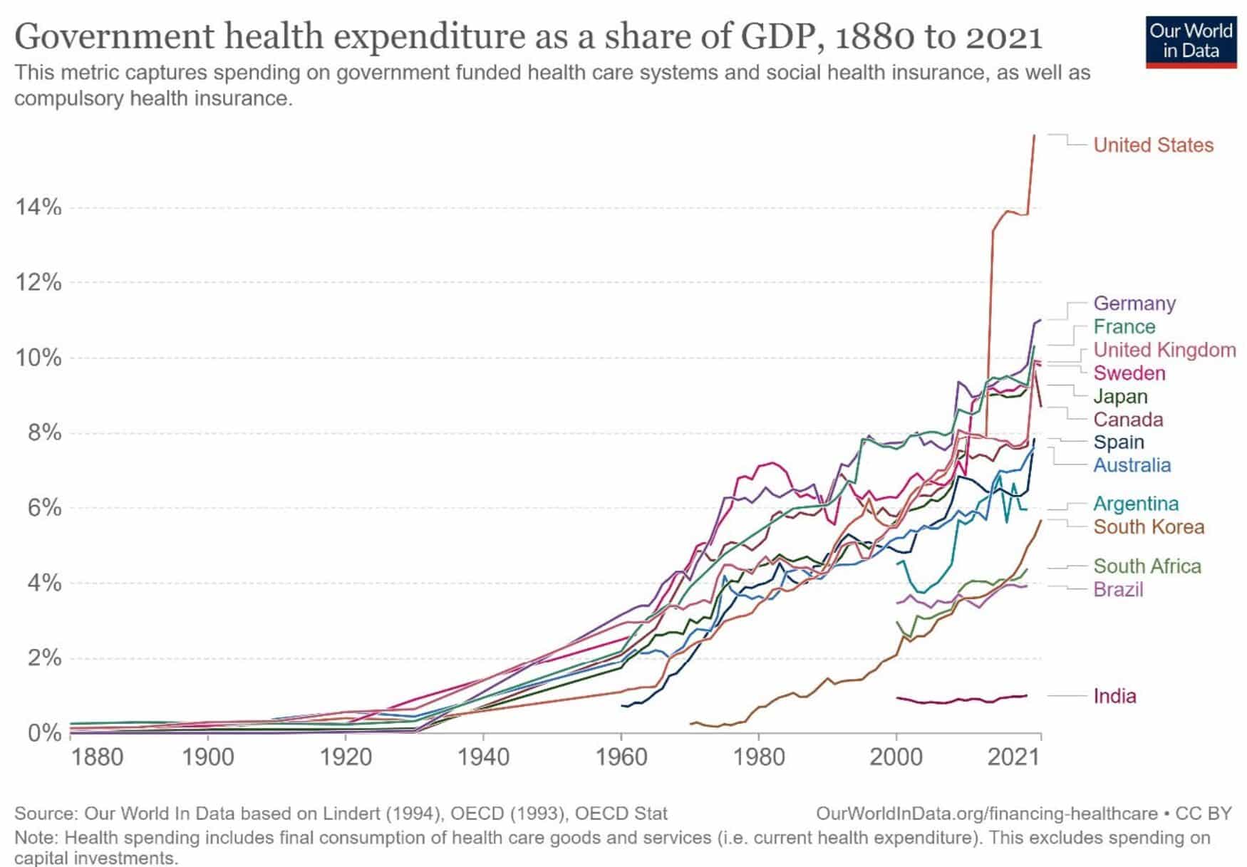 - Стабильно высокие расходы на здравоохранение с тенденцией к росту. За последние несколько десятилетий расходы выросли в несколько раз (оценка в процентах от ВВП).