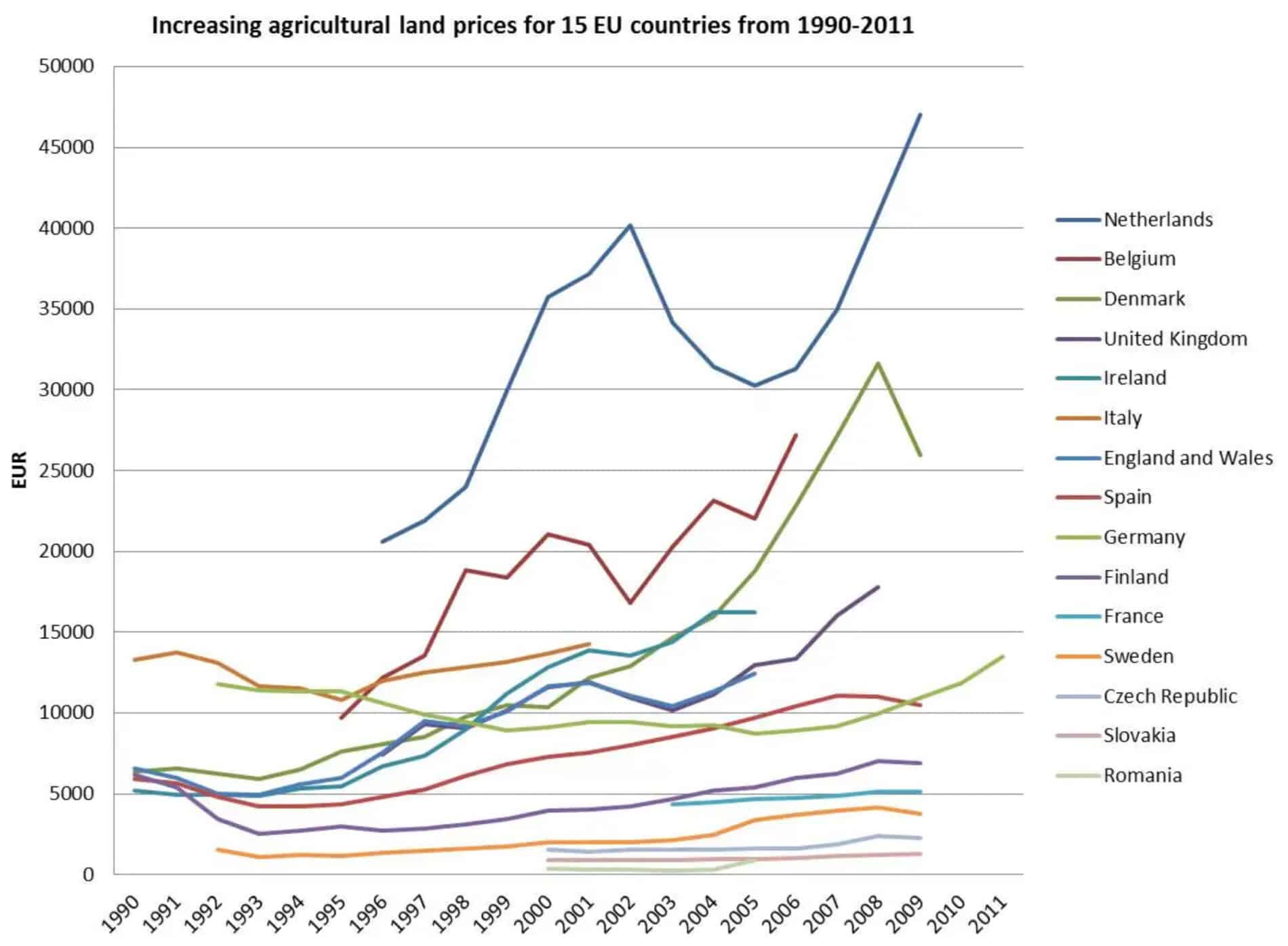 Что касается потенциала роста цен, то все зависит от конкретной страны и временного участка. Например, в Германии на дистанции с конца 90-х по конец нулевых стоимость с/х земли стагнировала. В Дании на той же дистанции она выросла примерно в 3 раза, в Швеции рост был символическим, В Нидерландах цена земли выросла вдвое, затем упала на 25% и продолжился резкий рост.
