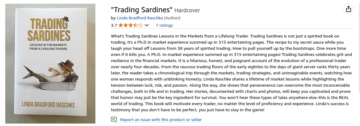2. «Trading Sardines» (2019): Честная автобиография. Спустя 23 года Линда выпустила вторую книгу — на этот раз сольную и глубоко личную. Это не сборник стратегий, а честный, смешной и поучительный рассказ о ее жизни. Линда без прикрас рассказывает о своих самых больших ошибках (включая потерю $100,000 за день), нелепых случаях (легендарная история о коте, который наторговал на клавиатуре) и психологических трудностях.
