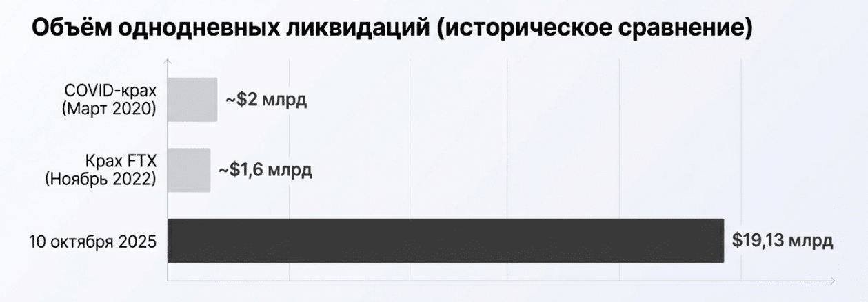 - 11 октября: Bitcoin на минимуме около $102,000. Общий объём ликвидаций — $19,13 млрд.