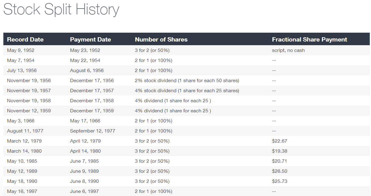 Первое дробление акций состоялось 23 мая 1952 г., тогда использовалась пропорция 3 к 2 – 2 старые акции превратились в 3 новые. В промежуток с 1956 г. по 1959 г. количество ценных бумаг увеличивалось 4 раза за счет выплат дивидендов, позже продолжились стандартные сплиты. После каждого увеличения количества акций их стоимость корректировалась в сторону понижения для того, чтобы капитализация не изменилась.