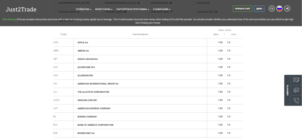 - Простейший вариант – покупка акций через брокера, имеющего выход на NYSE. Это одна из крупнейших бирж мира, поэтому большинство брокеров дает к ней доступ. Перед тем как открывать счет у конкретной компании обязательно проверьте есть ли в перечне поддерживаемых инструментов акции Boeing. В примере ниже – фрагмент списка доступных акций у брокера Just2Trade, акции ВА есть, значит их можно будет купить, отдав приказ через торговый терминал.