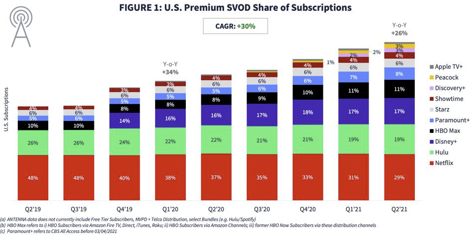 - Возросшей конкуренции. Если в 2019 г. на Нетфликс приходилось порядка половины американского рынка, то в 2021 г. доля снизилась до 29%. Замедлился и рост базы подписчиков.