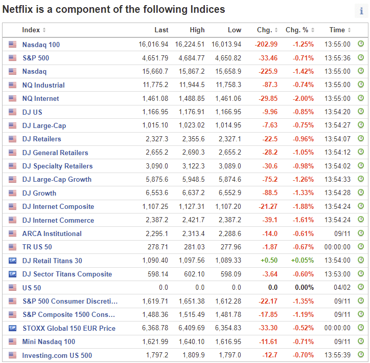 Стоимость акций Netflix растет не только из-за роста бизнеса, но и из-за того, что эти бумаги входят в ряд крупных биржевых индексов. Биржевые фонды копируют эти индексы, что обеспечивает дополнительный спрос на акции NFLX. Эти бумаги задействованы в: