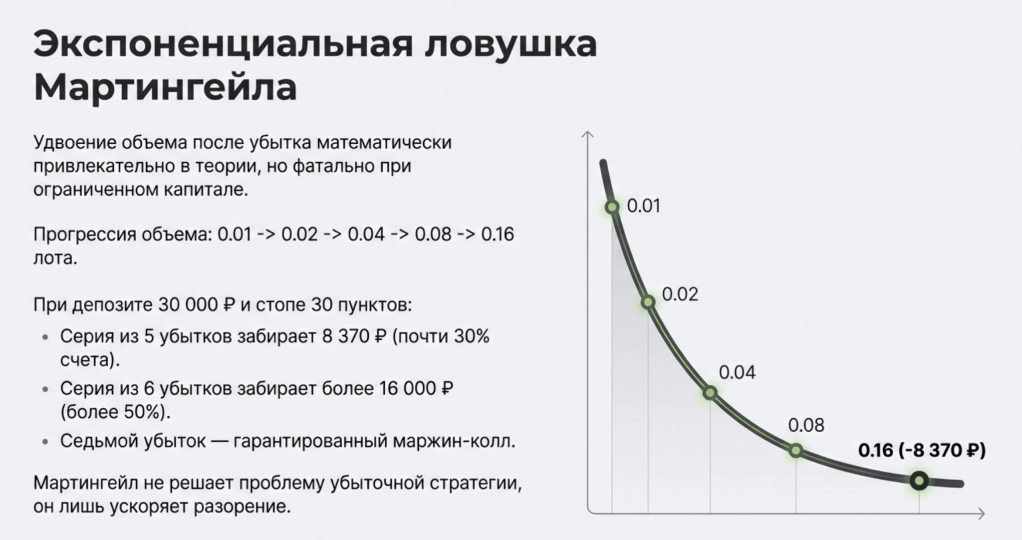 Мартингейл — система, при которой после каждого убытка трейдер удваивает объём следующей сделки. Математически это выглядит привлекательно, но реальность жёстче.