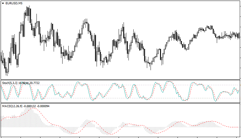 Хорошо работает комбинация стохастика и MACD. При совпадении сигналов входим в рынок с целью в половину диапазона консолидации. Лучше брать поменьше, но почаще — ведь используется крупный объём средств.