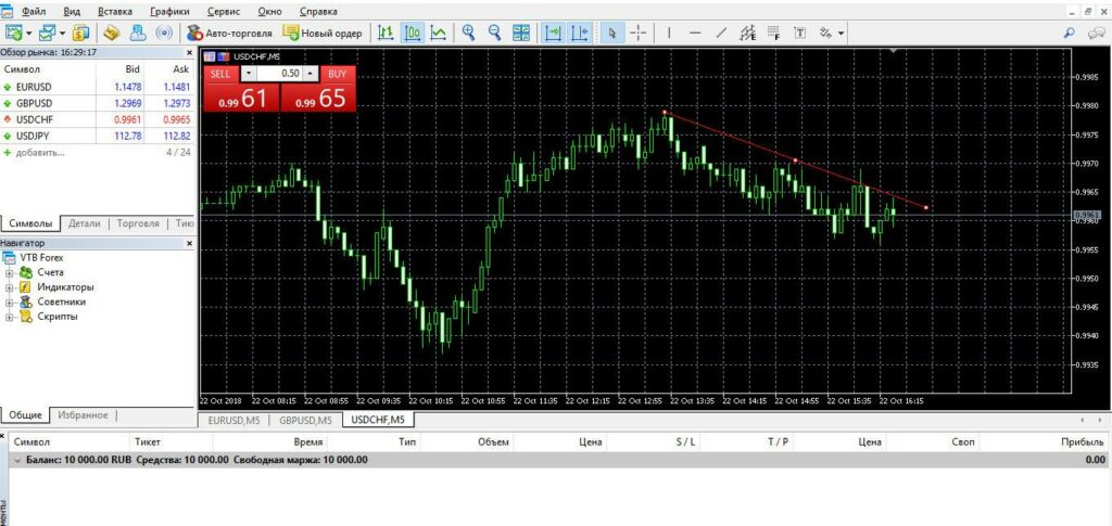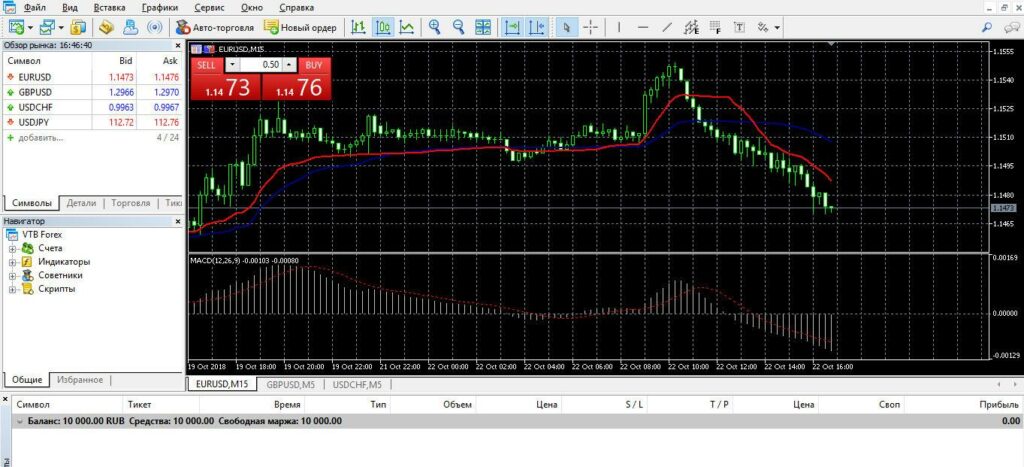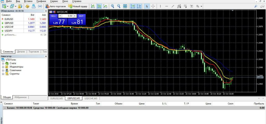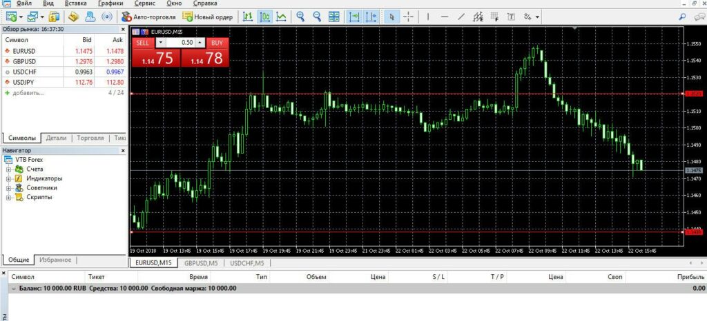 - Окно котировок (Market Watch) — список торгуемых инструментов и текущие цены bid/ask в реальном времени.