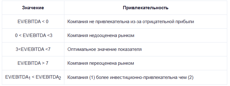 - EV/EBITDA – смысл показателя тот же, что и у P/E, но за счет того, что в EBITDA не учитываются различного рода отчисления этот мультипликатор подходит для сравнения бизнеса из разных стран. Основное требование заключается в том, чтобы этот показатель был больше 0, но меньше 3,0. Если соотношение EV/EBITDA невысокое, но больше 0, то компания считается недооцененной.