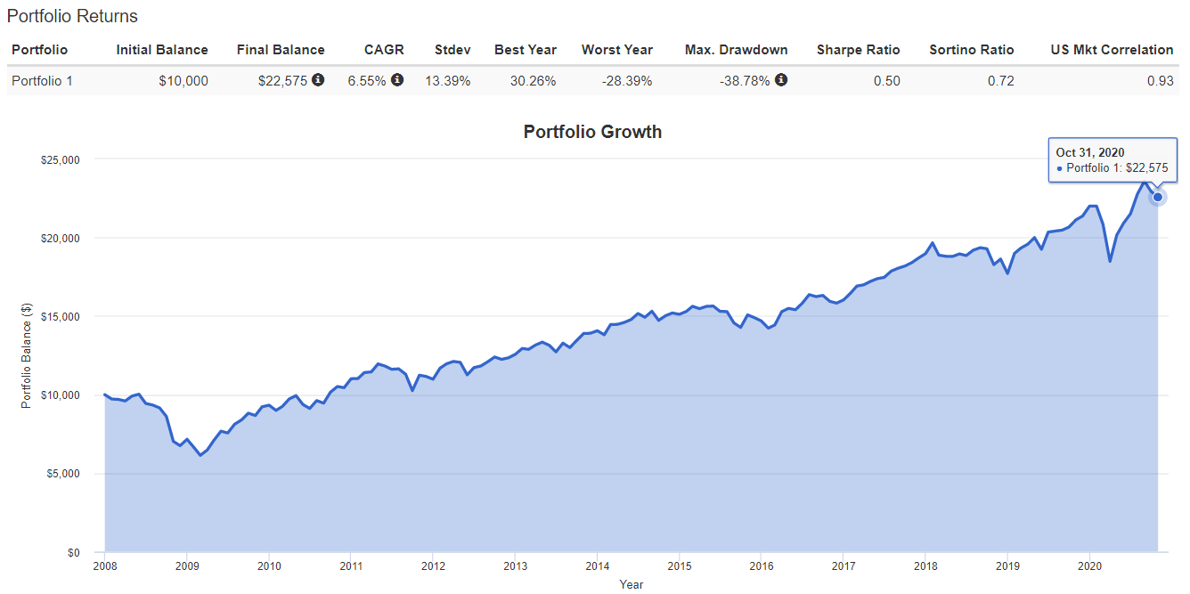 Как видите, портфель успешно пережил кризис 2008 г. и неплохо себя чувствовал следующие 12 лет. Даже кризис, вызванный пандемией, не стал проблемой.