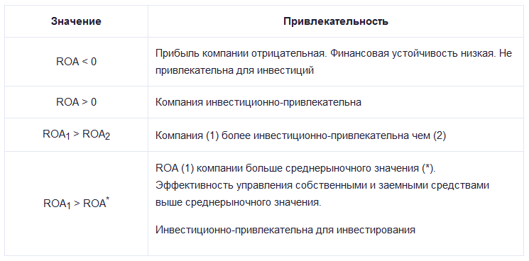 - ROA – чистая прибыль отнесена к стоимости собственных и заемных активов. Показывает эффективность использования всех активов. Менее значим по сравнению с ROE;