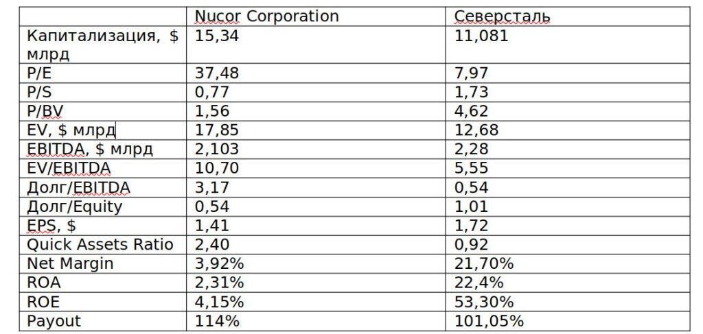 - что касается долговой нагрузки, то соотношение долга к эквити лучше у Ньюкор Корпорэйшен. При этом debt/EBITDA лучше у Северстали;
