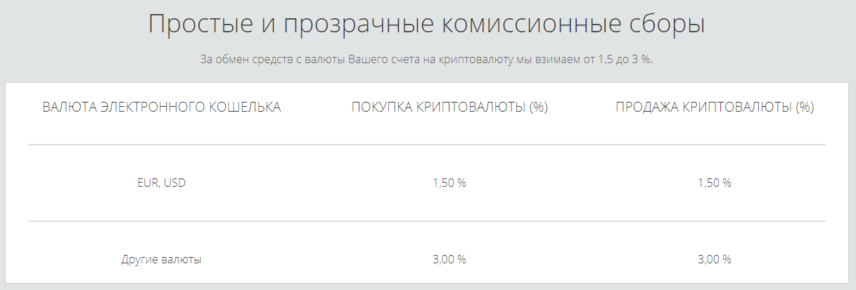Покупка крипты в системе не бесплатна. Заплатить придется от 1,5% до 3,0% в зависимости от валюты кошелька. При продаже комиссионные отчисления в пользу ЭПС те же.