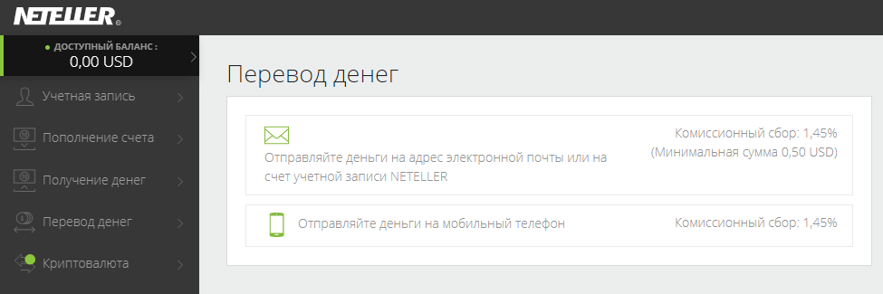 Деньги можно отправить на email или мобильный телефон с комиссией со стороны ЭПС 1,45%. Для отправки средств на счете должно быть как минимум $5. Если получатель средств уже открыл кошелек Neteller, то средства он получит мгновенно.