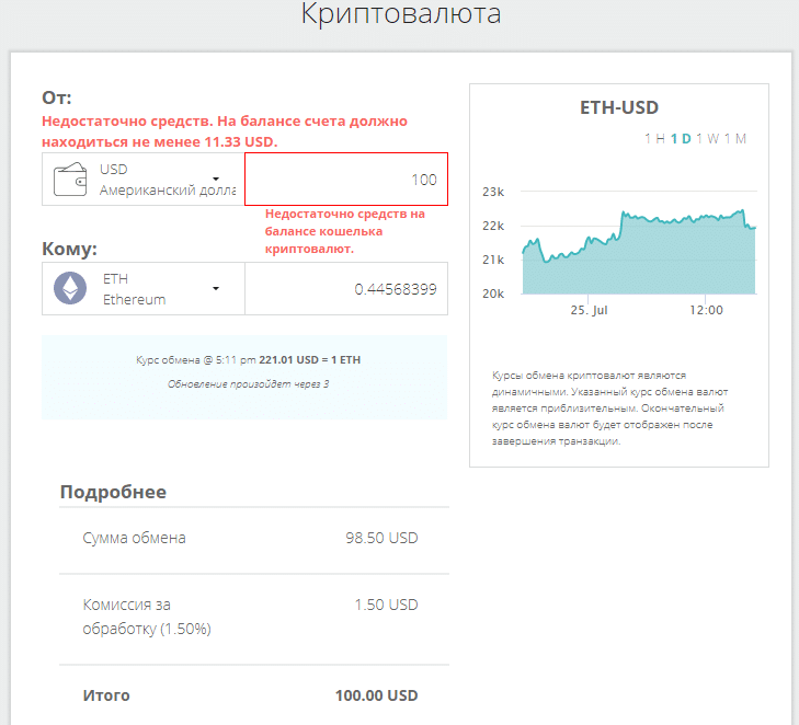 Покупка крипты производится через личный кабинет, в левой части под крипты отведен отдельный пункт меню. Процедура простейшая – выбираем, что отдадим за крипту (доллары с кошелька) и задаем, что хотим получить (выбирается криптовалюта).