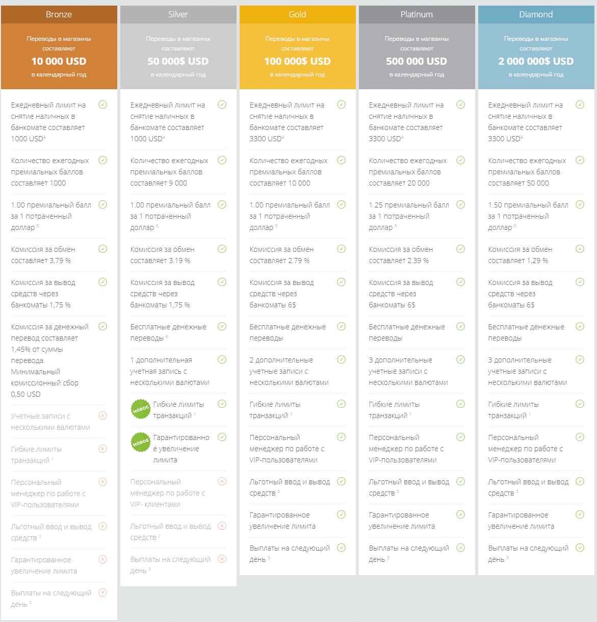 Всего выделяют 5 уровней – от бронзового до бриллиантового. Для высших уровней требуется высокий годовой оборот по кошельку.