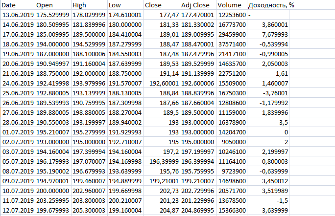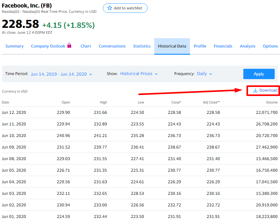 Мы идём на сайт с котировками и выбираем интересующую нас бумагу, пусть это будет Фейсбук. Ищем возможность скачать данные по торгам в формате таблицы, обычно это файл с расширением CSV, в нём содержится информация о дате, открытии и закрытии цен. Открываем этот файл в офисной программе Excel (могут возникнуть сложности, но всё легко устраняется, практически все версии последних 15 лет без проблем поддерживают такой формат данных).