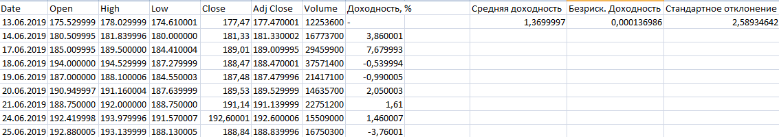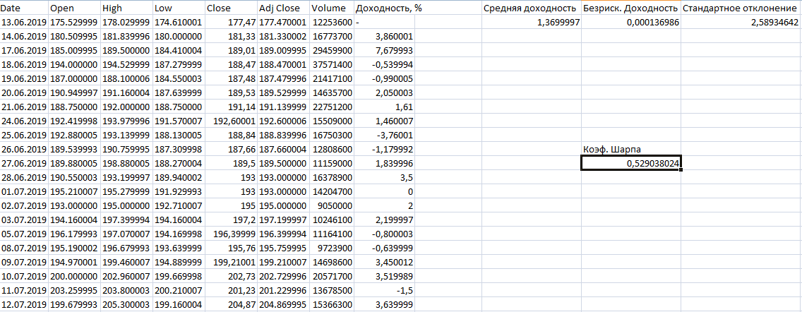 У нас получается таблица, которую далее мы будем анализировать. Нам нужны дополнительные столбцы, начинаем с доходности. Она высчитывается как просто разница цен текущего дня и вчерашнего, поделенная на вчерашний день. Простейшая операция, которую проводим для каждого дня – один раз ввели формулу, и далее просто растянули на весь столбец. Теперь у нас показатель последовательного изменения цен и выражен он в процентах, что и требуется для формулы коэффициента Шарпа.