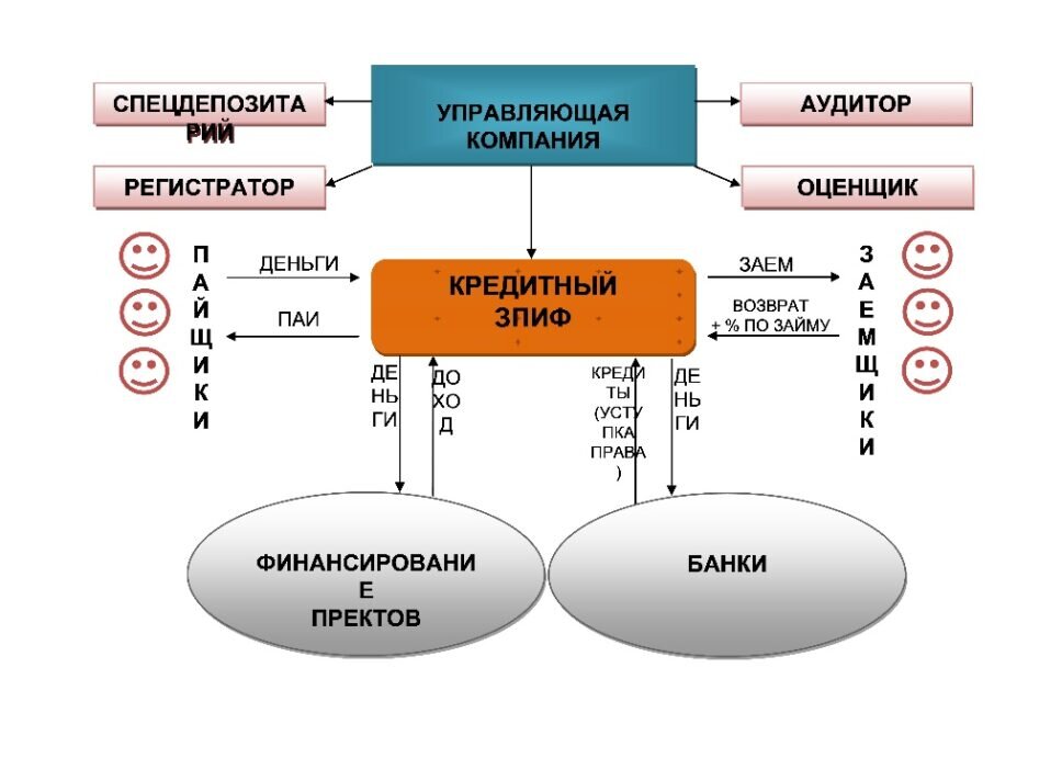 КФ имеет право выдавать денежные займы физическим лицам и организациям, выкупать кредитные обязательства с большим дисконтом у сторонних банков и т.д. Полная схема работы закрытых кредитных фондов указана на схеме.