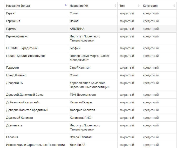 Просмотреть список кредитных ПИФов России можно на сайте https://investfuture.ru/ в разделе «ПИФы» – категория фондов «Кредитные».