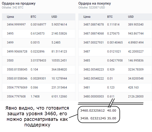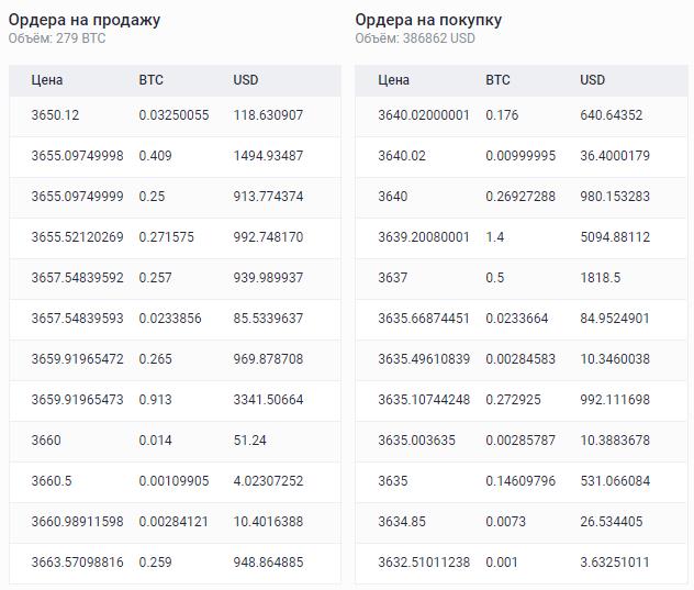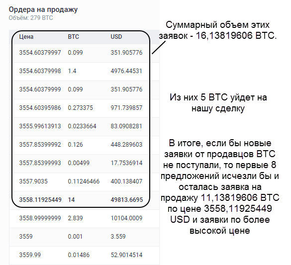 - если бы постоянно не добавлялись новые предложения о продаже ВТС, то в перечне заявок осталась бы частично поглощенная нашей сделкой заявка объемом уже 11,13819606 ВТС по цене $3558,11925449, и предложения по более высокой цене;