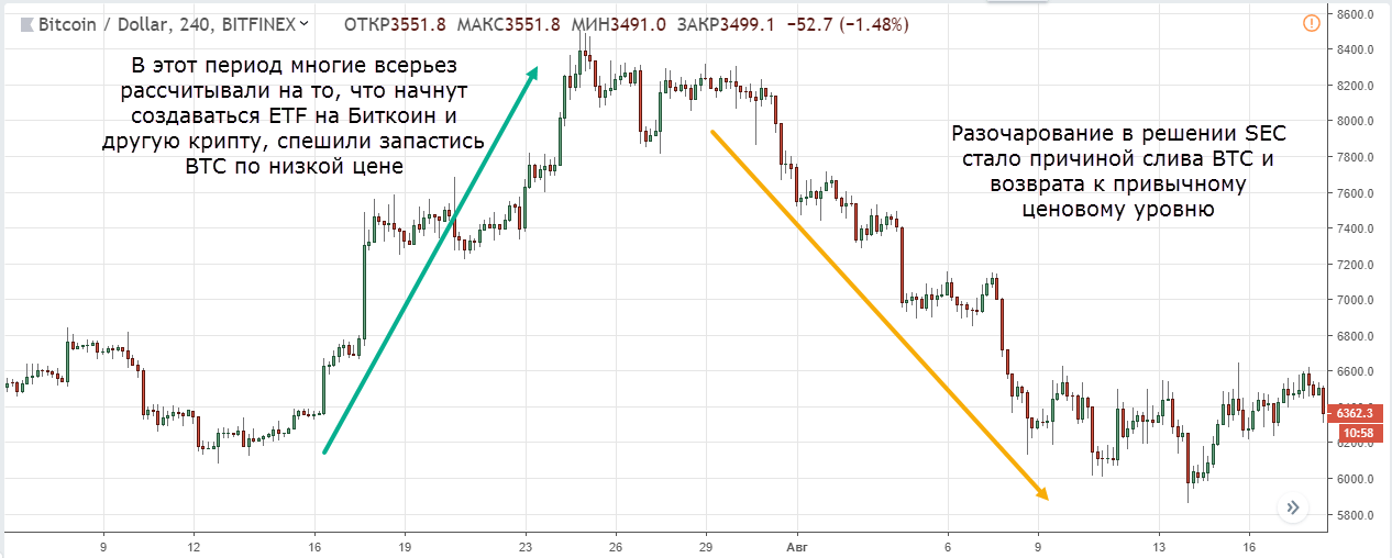 Пример – летом 2018 г. все рассчитывали на положительное решение в отношении ETF на крипту от SEC. На фоне этого Биткоин вырос примерно на $2000.