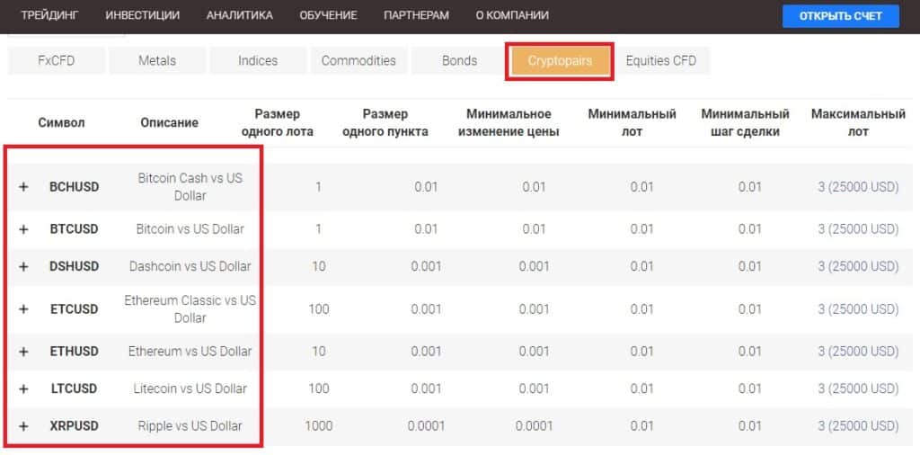 - Поддержку в разы меньшего количества криптовалют. Если на некоторых криптобиржах поддерживаются сотни монет, то брокеры чаще ограничиваются 5-7 самыми ходовыми. Реже – несколькими десятками, но экзотических новых монет здесь вы не найдете. Ниже – перечень торгуемых криптовалют у брокера Амаркетс: