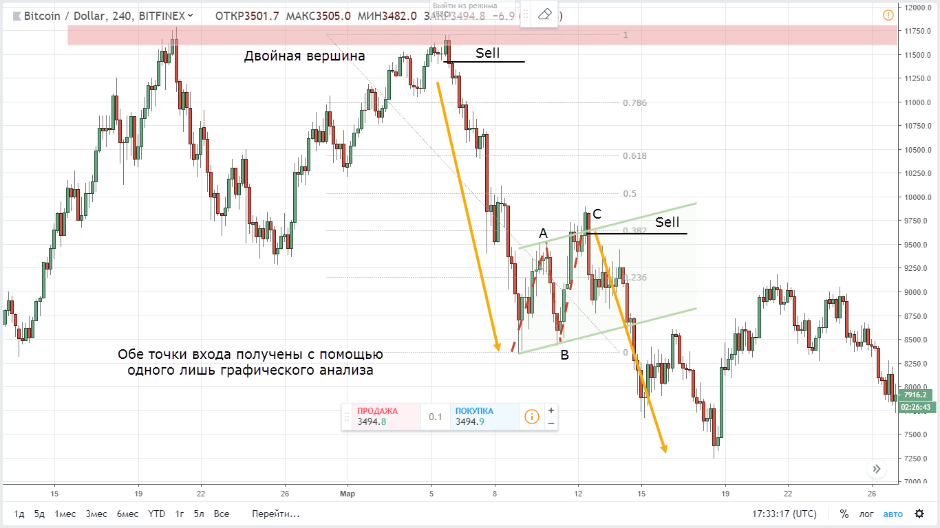 На рисунке выше показаны 2 точки входа по BTCUSD, для обеих достаточно владеть навыками технического анализа: