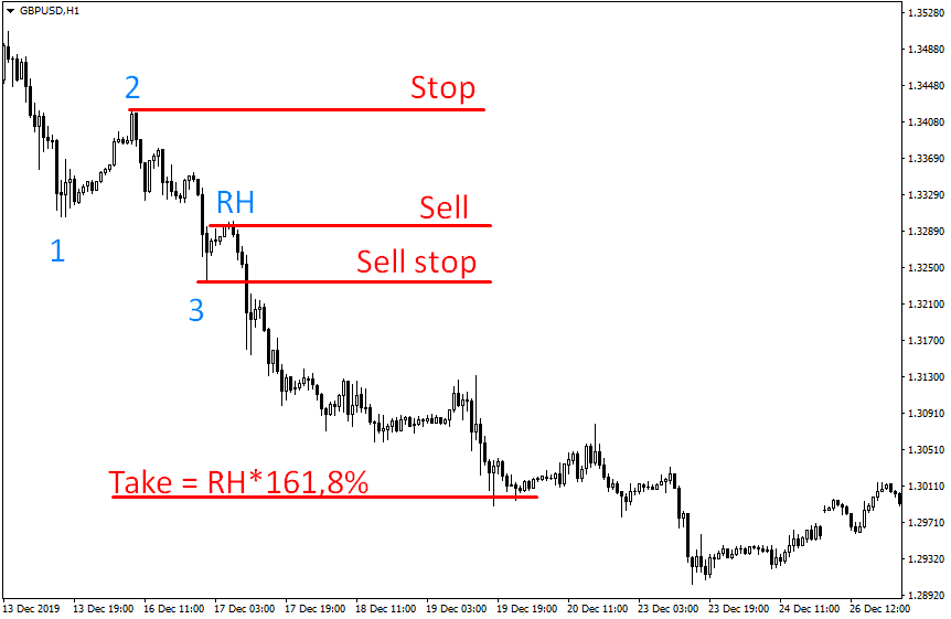 - У нас есть две волны для начинающегося тренда вниз. Примерно то же самое обычно используют как первую предпосылку к смене направления в большем масштабе. Итак, две заходные волны есть, начинается самое главное движение – третье. Оно направлено вниз и преодолевает точку 1. Теперь эта конструкция похожа на достаточно известный паттерн 123. Это по-прежнему может быть всего коррекцией в виде зигзага, поэтому для окончательного построения крюков Росса нам нужно продолжение.