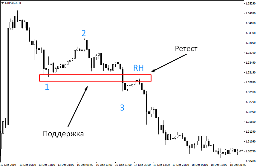 - Движение вниз развивается и преодолевается уровень точки 3. То есть, по сути, мы видим просто череду снижений и откатов. В точке, где заканчивается движение после RH, у нас получается RHR – Ross Hook Reversal.
