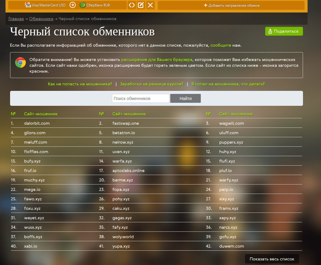 - Администрация сформировала «черный список обменников», которые являются мошенниками. Вы всегда можете зайти в этот раздел, и проверить, есть ли Ваш потенциальный обменник в этом списке.