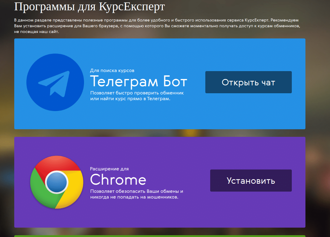 - Для удобства отслеживания курсов, и более удобного использования сервиса, Курс Эксперт предоставляет ряд программных решений, таких как телеграмм бот, расширения для браузеров и др.