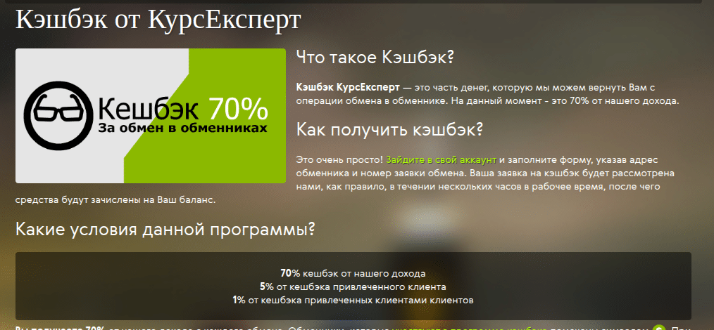 - Мониторинг предоставляет кэшбек 70% на операции обмена. Т.е. доход, который получает Курс Эксперт с Вашего обмена, может быть поделен с Вами. Внимательно почитайте инструкцию по получению кэшбека на сайте анализатора.
