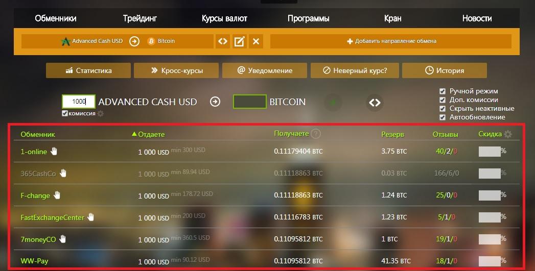 Для этого сервис в режиме реального времени мониторит информацию с топовых контор, обрабатывает ее и выдает на сайте в удобном структурированном виде. Пользователю остается только отфильтровать предложения по своим критериям и перейти на сайт подходящего обменника.