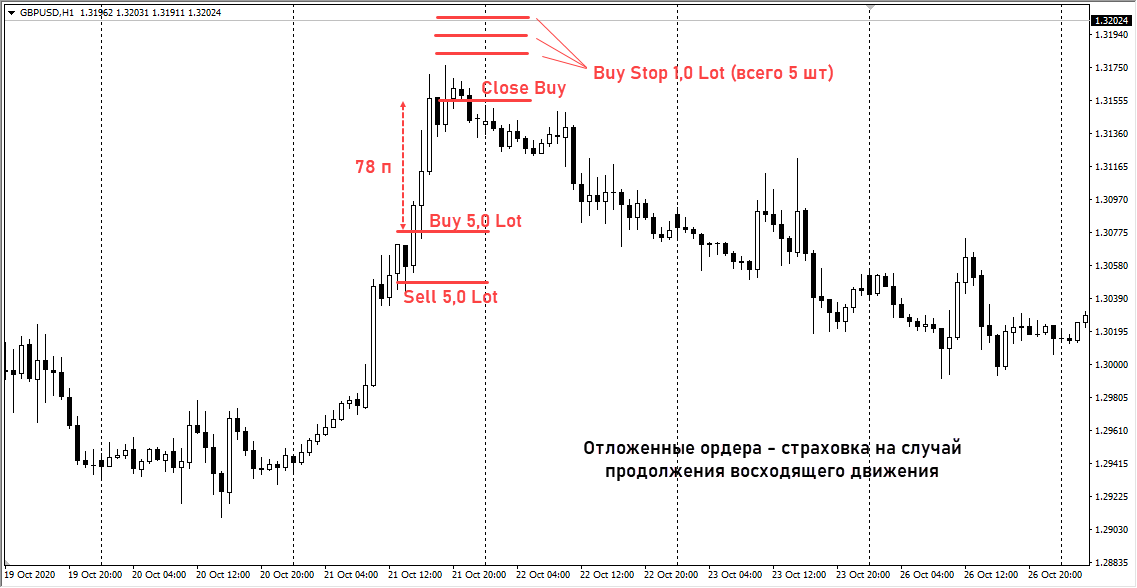 Помимо страховки нужно еще и снизить объем замка. В первой сделке на покупку использовался объем 5,0 лотов, он дробится на несколько ордеров, например, на 5 х Buy Stop по 1,0 лоту, они размещаются на небольшом расстоянии друг от друга.
