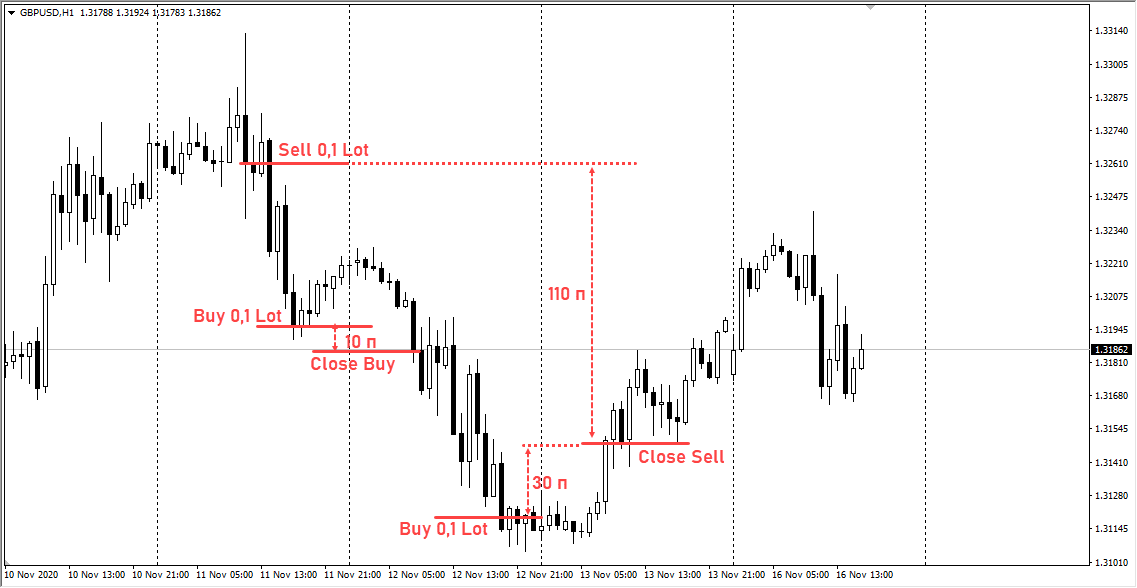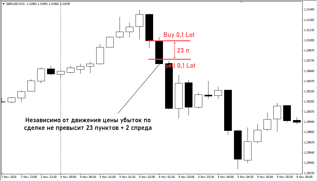 В примере ниже открыта сделка на покупку объемом 0,1 лота. Прогноз оказался ошибочным, но трейдер решил не закрывать сделку на продажу, а ограничить убыток за счет открытия короткой позиции объемом 0,1 лота.