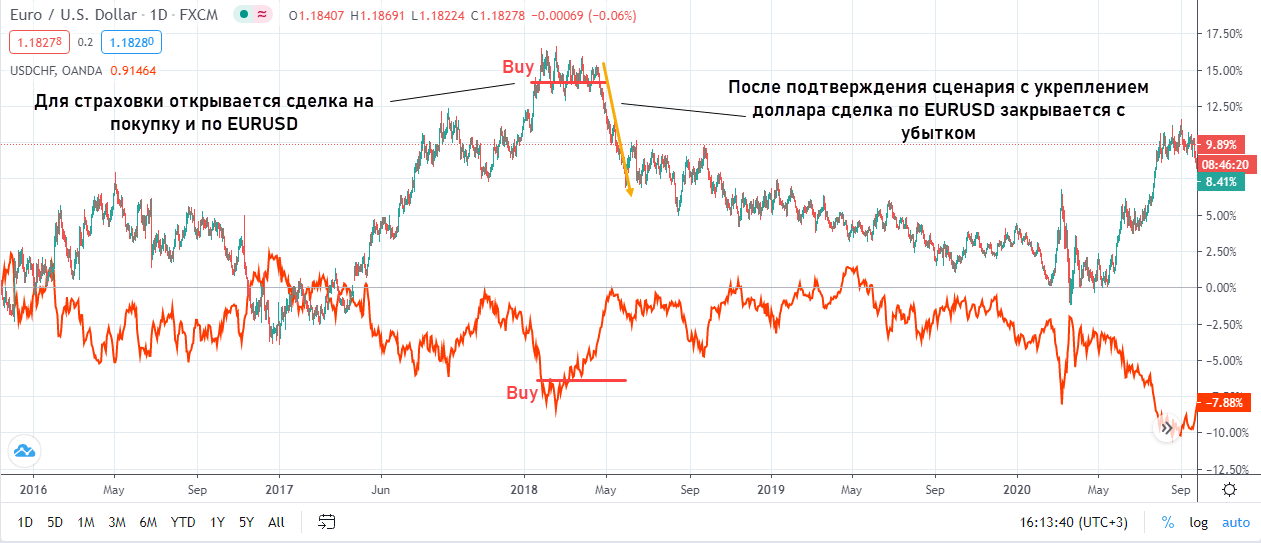 Хороший пример обратной корреляции – пары EURUSD и USDCHF. Если открыта длинная позиция по USDCHF, то для подстраховки трейдер может захеджировать риски и войти в рынок по EURUSD.