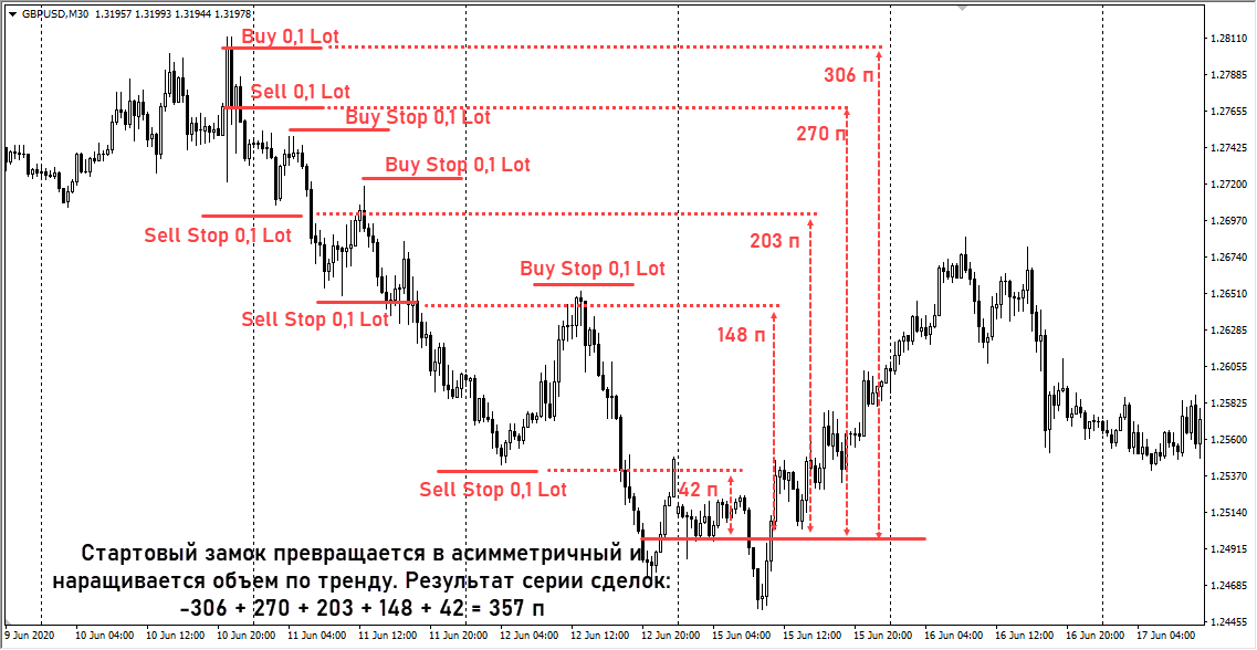 Эта схема идеально подходит для ситуаций, когда после локирования начинается тренд средней силы. Используются отложенные ордера Sell Stop и Buy Stop.