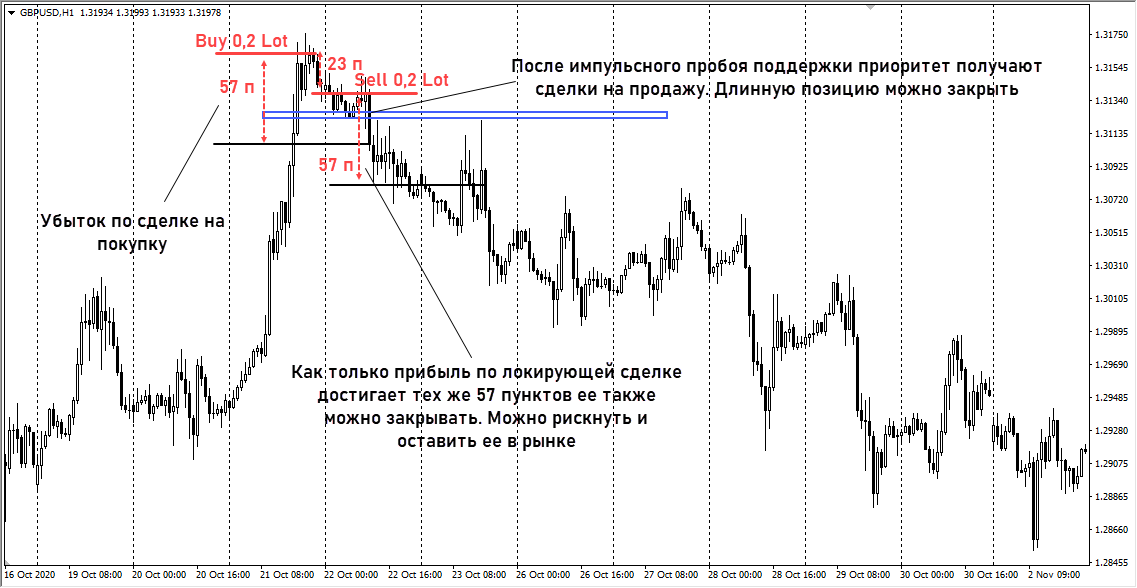 В отличие от предыдущих ситуаций при положительном локировании трейдер открывает встречную сделку при отработке базового сценария. Локирующая позиция используется как аналог фиксированного тейк-профита.