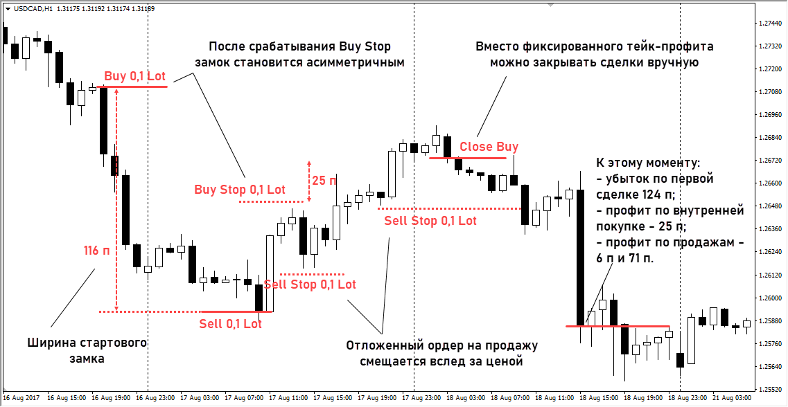 В момент входа в замок график ушел в убыточную сторону на расстояние 23 пункта, этот результат и будет заморожен до момента выход из замка. Даже если график пройдет 500 пунктов в любую из сторон выход из этой ситуации даст убыток в 23 пункта + 2 спреда.