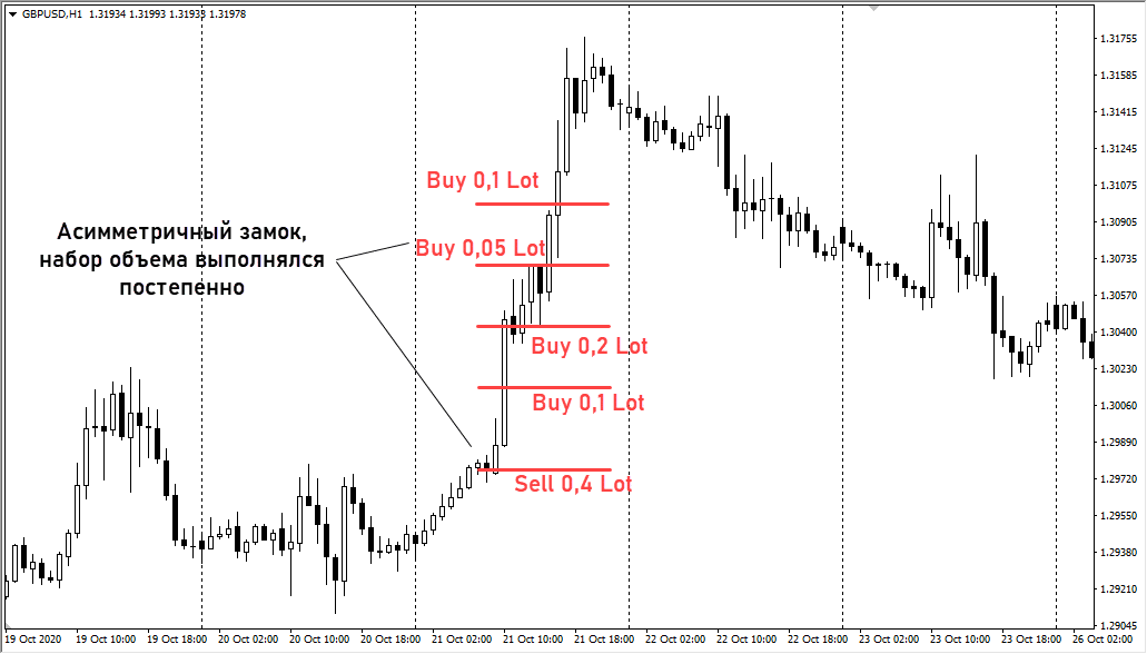 - асимметричное, объем в одном из направлений выше. Применяется в случаях, когда есть приоритетное направление движения, прогноз пока не отрабатывает и трейдер для страховки использует лок.