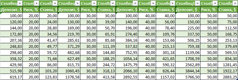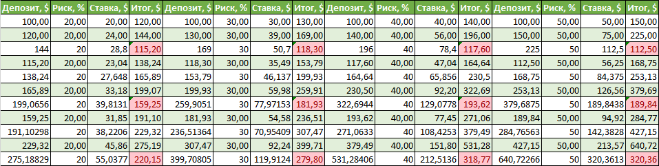 Условия. С уровнем риска в 20%, 30%, 40% и 50%. Стартовый депозит составляет $100, и предполагаем, что трейдеру удалось попасть на серию из 10 прибыльных сделок подряд.