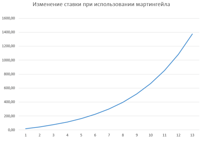 Предположим, выдалась неудачная серия из 15 сделок подряд, в расчете выясним, как изменяются потери для этих вариантов ММ.