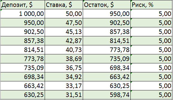 - С минимальным риском торгуете пока депозит не вырастет, например, на 50%;