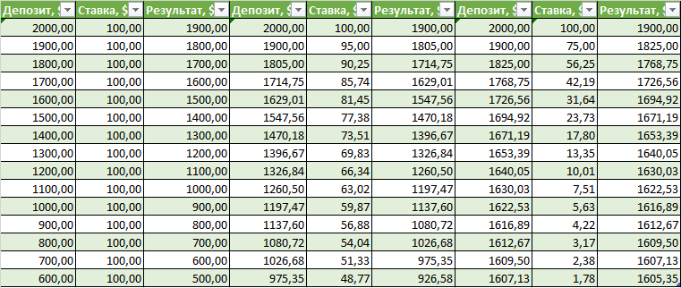Если бы после каждой неудачной сделки пересчитывалась стоимость опциона исходя из риска в 5%, т.е. использовался бы плавающий размер опционов, то картина бы изменилась. Убыток составил уже бы не $500, а $401,26 на той же серии неудачных сделок. В процентах убыток снизился бы на 19,75%.