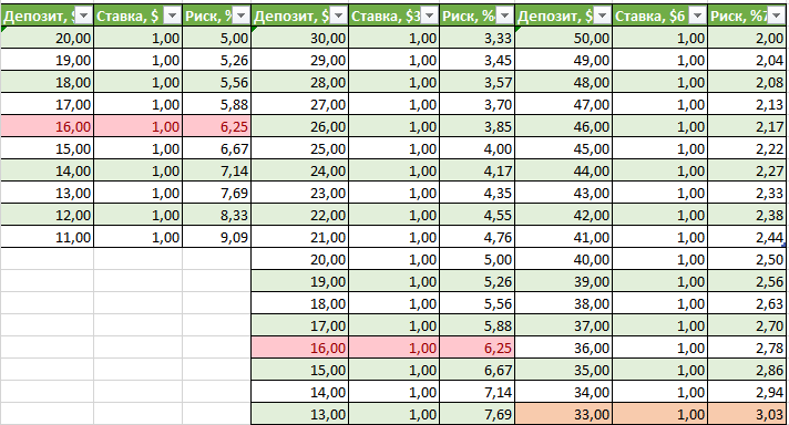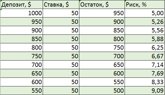 Нужно определить, на какой по счету неудачной сделке подряд будет превышен допустимый риск по сделке при разных стартовых депозитах. Для простоты расчетов полагаем, что убыточные сделки идут одна за одной.